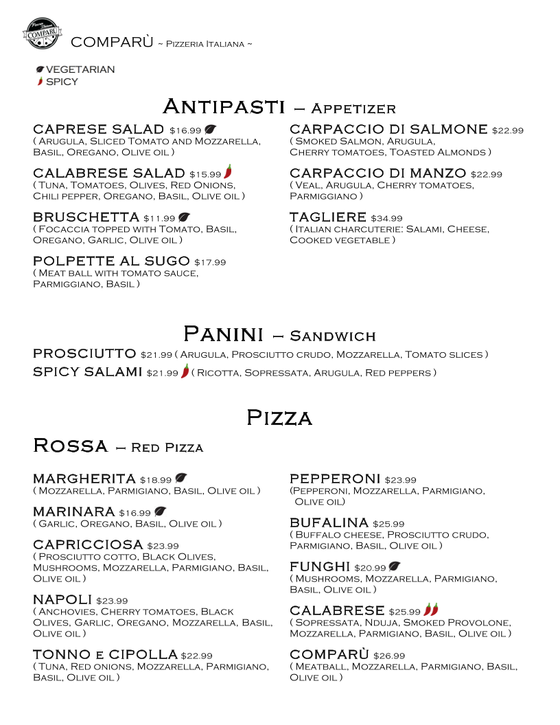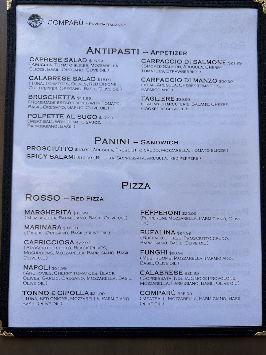 The menu at Comparù offers a thoughtfully curated selection of Italian-inspired dishes, focusing on authentic Neapolitan pizza alongside simple yet satisfying starters and desserts. Whether you’re stopping by for a casual lunch, a relaxed dinner, or ordering in for a cozy night at home, the menu balances comforting flavors with fresh, quality ingredients.